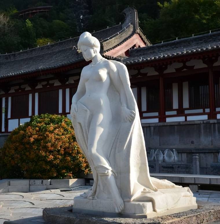 那尊名为“贵妃出浴”的雕像,通体明净,闪现的是杨玉环刚从温泉中走出的形状,人物的上半身完整暴露,描写得很是严密。