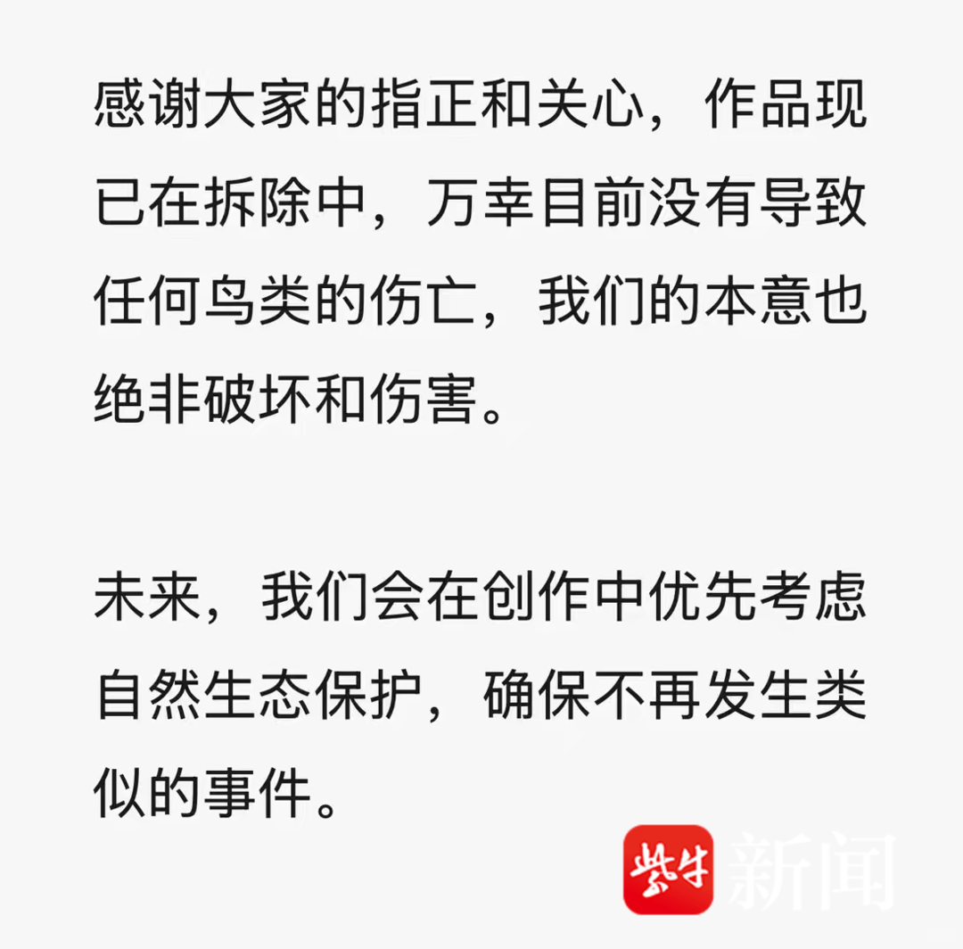 SSG团队15日正午通过社交媒体显露致歉,“感激公共的赐正和存眷,作品现已正在拆除中,万幸目前没有导致任何鸟类的伤亡,咱们的本意也绝非阻挠和凌辱。改日,咱们会正在创作中优先思索自然生态回护,确保不再发作相像的事宜。”