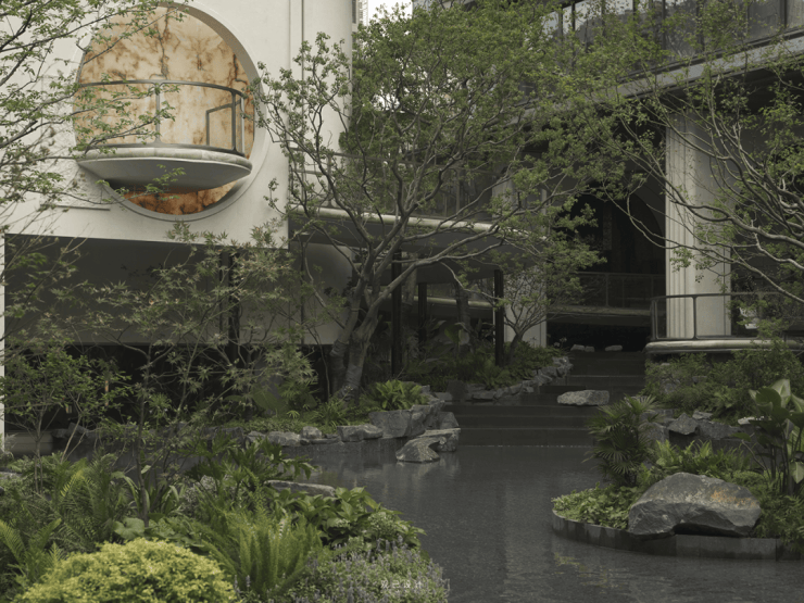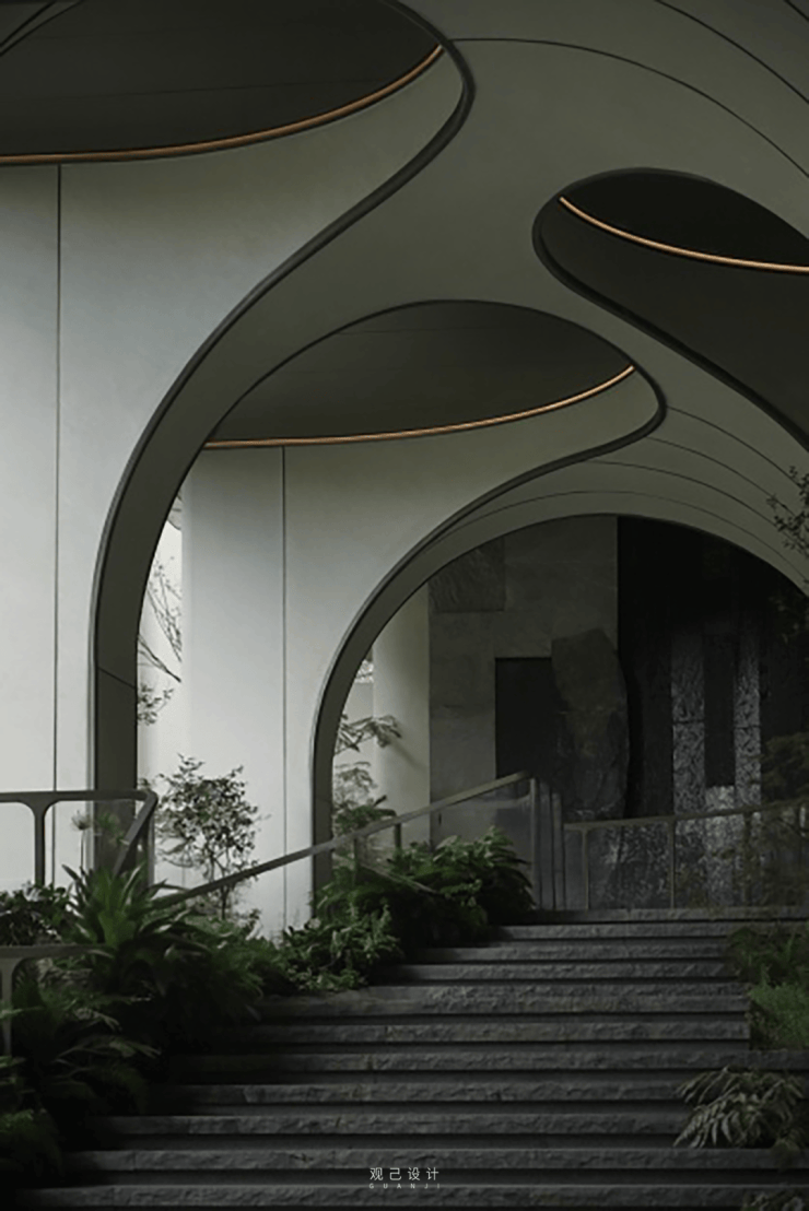 门楼内提取线条与门柱协调,似乎是一股气韵将屋檐向上托举,提取自姑苏砖雕窗花的形状,极致的线条交织下,正在摩登感中融入姑苏古筑特有的灵动风韵.