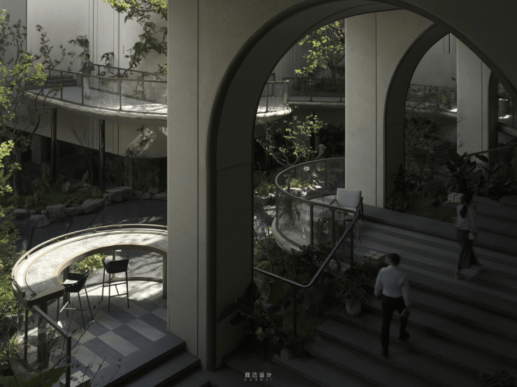 拱阙廊桥的孔洞打算,取法姑苏太湖石“众孔透景”的意趣.孔洞从侧面蜿蜒至顶部,将点状雕塑化为滚动的“空间雕塑”.人行走其间,透过分别孔洞望去,景色随脚步流转而幻化,每一步都藏着“移步换景”的巧思与惊喜.